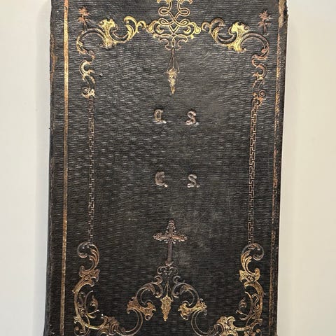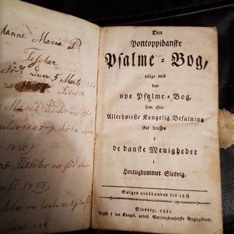 Den Pontoppidanske Psalmebog, trykt i Slesvig 1838, med guldsnit, indbundet i læder med guldtryk, sønderjysk sølvspænde, punslet med initialer og årstal 1842. Indvendig med påskriften: Tilhører Maria Kjerstine RasmusDatter, Wonsyldmark? 26 Febr, 1842. 18 x 11 cm. Fremstår med aldersrelateret patina, revne i læder i ryggen, samt en del af spændet mangler.