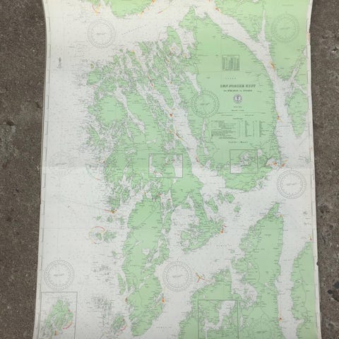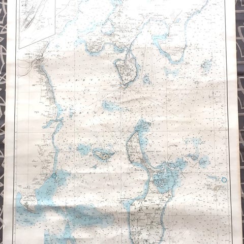 Vintage kort over den Norske kyst, fra Kopervik og Utsira til Bömahuk. Skala 1 : 50.000. Nr. 18. Udgivet af Norges Geografiske Opmåling, Kristiania 1924. Rettet 1956. Mål: 79 x 76 cm. Med brugspatinering.