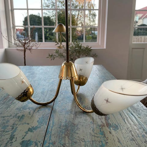 Messing lysekrone fra 1960'erne med hvide akryl skærme