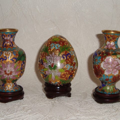 3 vaser i emaljeret metal - såkaldt cloissoné arbejde. Den mindste er en del ældre end de andre og måske fransk Champleve fra omkring 1900. Højde 9 cm. Den har mistet en del af emaljen (har dog kun haft det i udvalgte områder) og har lidt buler mm. 200kr