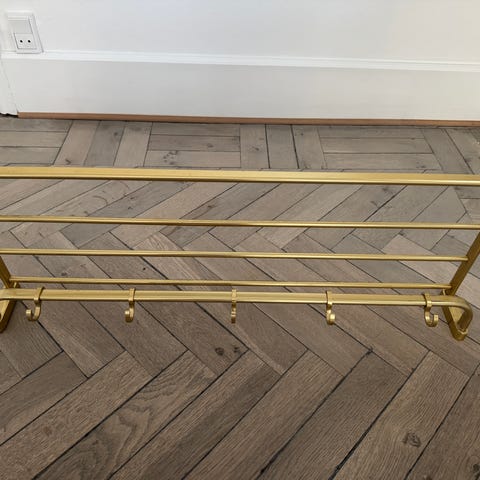 Messing hattehylde fra 1960'erne med 5 messingkroge (83cm lang)
