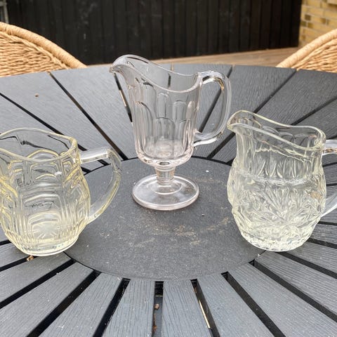 Tre vel snart antikke flødekander i presset glas - så vidt jeg ved, er de blæst i form. Måske fra Fyns Glasværk fra 1930. De to næsten ens har lidt hvidt i glasset. Ganske små nags i bundkant.