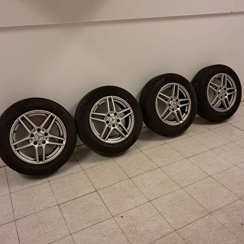 Et sæt super fine originale Mercedes A200 alufælge inkl. tpms ventiler med nokian vinterdæk str.205/55/16 ca.85-90% mønster. Kan monteres på din bil efter aftale. Prisen for hjulene er for 4 stk. først til mølle tilbudspris:-)