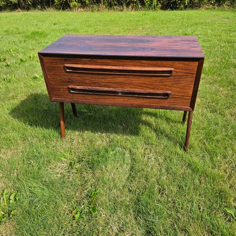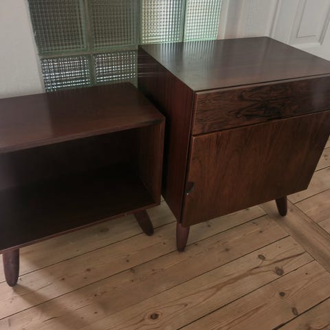 Dansk møbel arkitekt sengebord i palisander med top af sort glas plade . Mål : 45 cm L - 45 cm H - 28 cm D . Fremstår i pæn brugt stand . Vare nr 3243