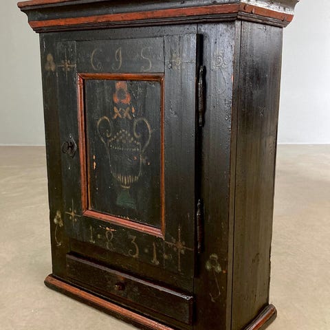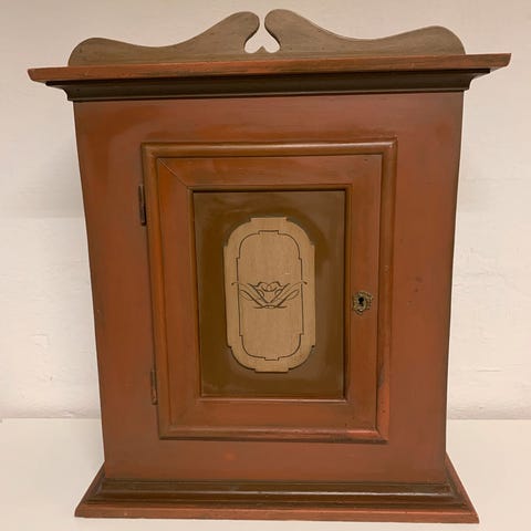 Unikt skab, med keramikplade på lågen, som afbilleder ridder i rustning.