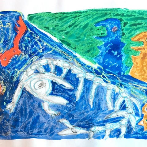 Komposition med fabeldyr. Signeret J. U. Friis. Akvarel og collage på papir. Uden ramme. 29,5 x 42 cm. (J59A)