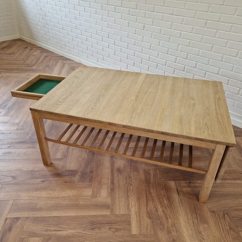 Sofabord i massivt stavlimet egetræ med skjult skuffe. Renset ned, slebet og behandlet med natur træsæbe fra Guardian.