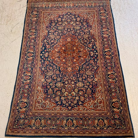 Smukt, håndvævet tæppe, i lidt utraditionelle farver, orange, brune, blå, grå, beige nuancer.