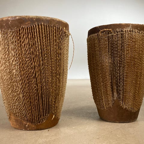 Retro tromme fra Afrika, lavet af kokosnød betrukket med python stand. I pæn stand. D. 25 cm.