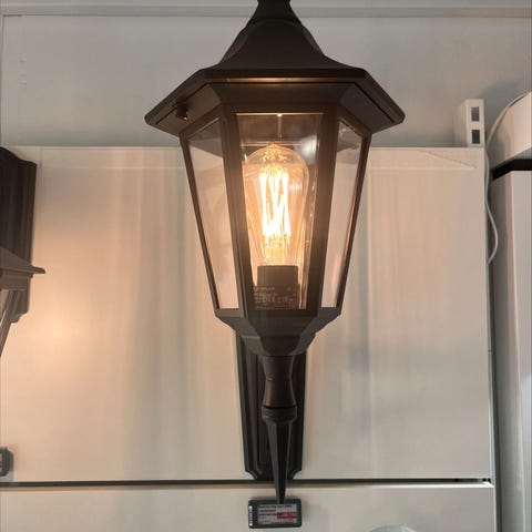 Lampen er til udendørs brug (IP55), og måler 27cm i højden og med dybden/fremspring på 39,5cm 1 stk haves