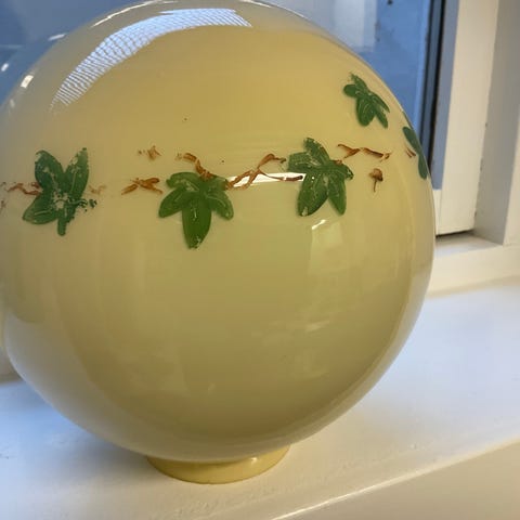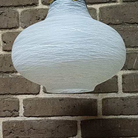 Flot lampe, med sirligt udsmykket ophæng i metal, samt glasskærm og tre fatninger.