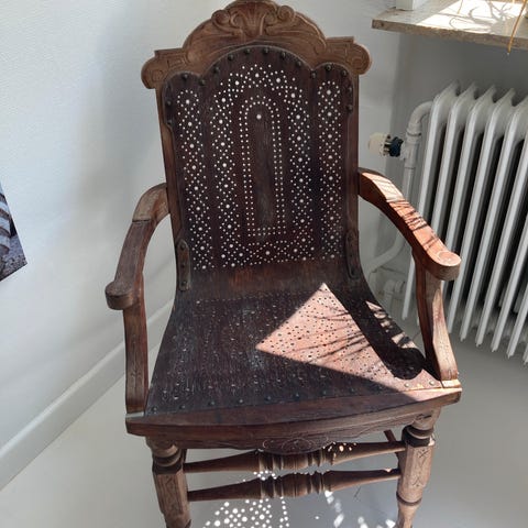 Unik hjemmelavet stol i fyrretræ, med sæde flettet i råhvid gjorde..