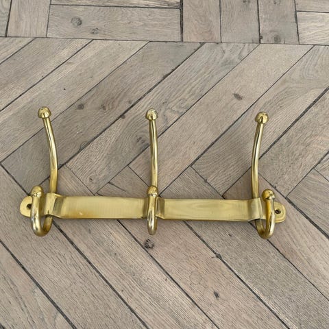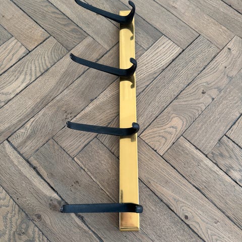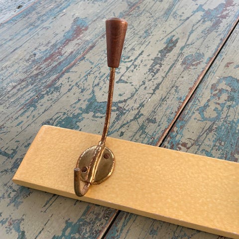 Gammel messing knagerække fra 1960'erne med 3 dobbelt-knager med de originale pastelfarver i (blå, beige og mintgrøn).
