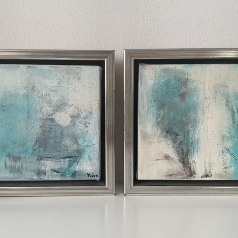 Et par kvadratiske samkørende værker, i klare, oplivende farver.