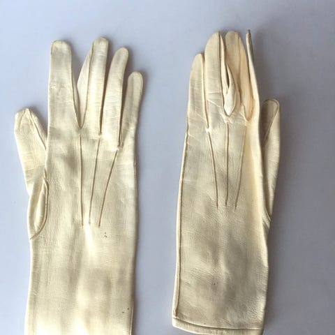 Et par cremefarvet funkis kørehandsker / cyklehandsker / handsker af tyndt skind. Første halvdel / midten 1900 tallet. For størrelse, se fotos.