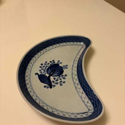Lys blå fajance med mørkeblå tulipan og flettet bort, samt halvmåne tunger, designet af Christian Joachim i 1914.