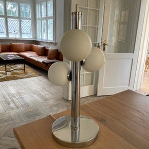 Smuk gammel bordlampe fra 1950'erne i Art Deco stil. Krom lampe med blanke opalglas kupler.