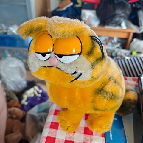Disse vintage Garfield og Futte ( Odie ) bamser er sjældne samleobjekter, som stammer fra 1980'erne. Futte-bamsen er fra 1983, designet af R. Dakin & Co, baseret i San Francisco, Californien. Begge bamser er brugte, hvilket giver dem lidt patina, men de er ellers i god stand. Fanns vil sikkert værdsætte deres alder og autenticitet. Bamsen af Futte er særlig interessant, da den har tydelig produktionsinformation og er fra en populær periode i Garfield-universet. De sælges sammen og prisen er for dem alle