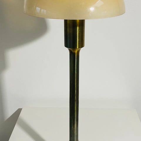 Sjælden Niels Rasmussen standerlampe i messing med skærm i kunststof . Model kongelys for Fog og mørup . Mål : 146 cm H - ø 55 cm . Fremstår med mærker på fod . Vare nr 3662