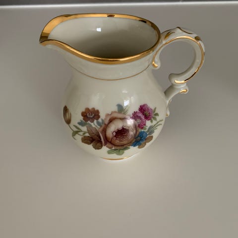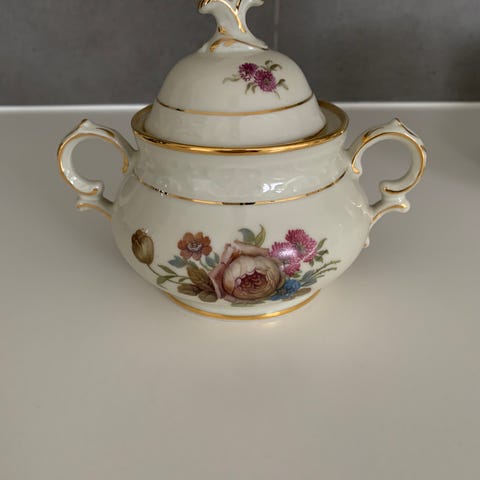 Har et sæt rosenborg sukkerskål og flødekande.