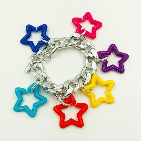 Klassiske vintage armbånd i massiv, farvet plastik. Det lyseblå og det mørkerøde er melerede i farven. De andre helt ensfarvede. Meget flot, når man har mange på sammen og man kan gå og lave raslelyd. Indre dia 6,7 cm. De er vintage men ubrugte. Små medfødte fejl og lidt spor efter mange års opbevaring.
