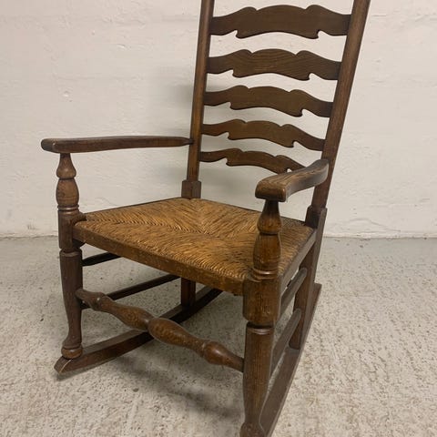 Sæde og ryg er betrukket med stribet stof i afdæmpede og alligevel iøjnefaldende farver.