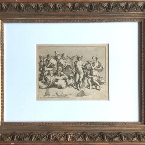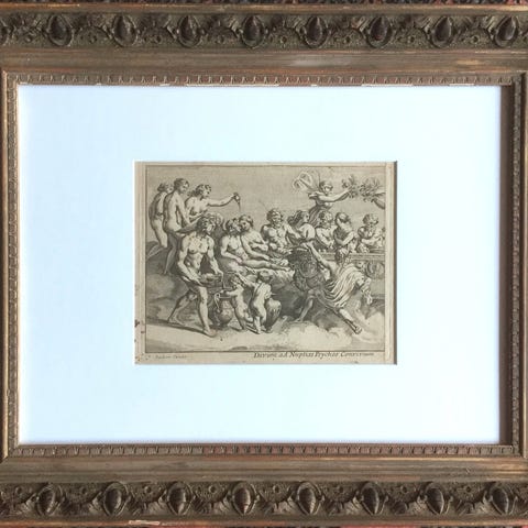 Amor og Psyches bryllup. Betitlet Raphaelis Urbinatis mirus labor in palatio guisae Romae. Efter Raphaels fresko i Farnesina. Udgået fra Susanne Maria von Sandrart. Nuremberg, cirka år 1700. Med passepartout og ramme af forgyldt træ. Lysmål 20 x 26 cm. Ramme 48 x 62 cm.