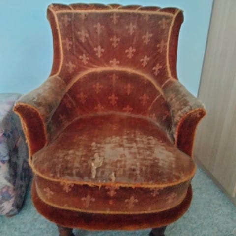 Viktoriansk lænestol af rigt udskåret nøddetræ, med cabriole ben og hjul af messing og horn. Betræk af bordeaux farvet uld. England, 1800 tallets sidste halvdel. H. 87. B. 62. D. 72 cm. Siddehøjde 37 cm.