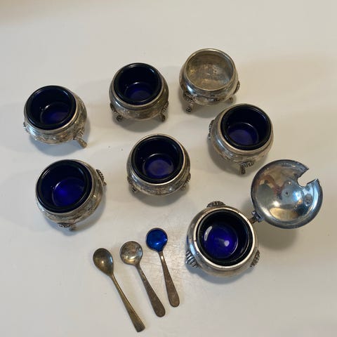 Vaseformet saltkar i empire stil af nysølv / forsølvet metal med original skål af blå glas. Cirka år 1900. Udgået fra WMF, Tyskland. Mål: H. 7. L. 13. D. 6,5 cm. Med almindelig brugsslidtage / i fin stand.