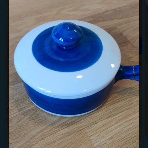 Rörstand blå koka sukkerskål. Måler 5½x9 cm. Hel og fin stand Pris 150kr.