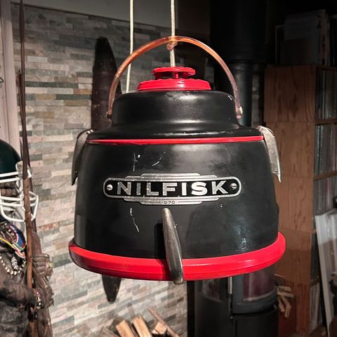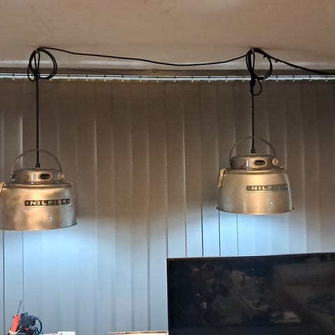 Redesign Nilfisk loftlampe ( pendel) i bemalet sort og med sort stof ledning. Brugsspor. Pris 950kr pr stk.