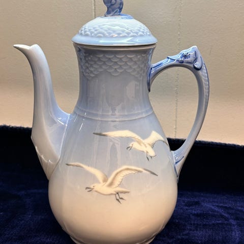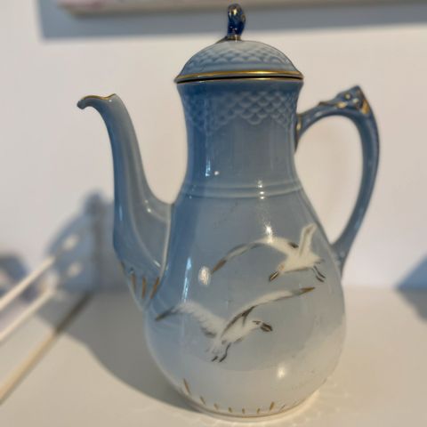 Bing & Grøndahl, Måge med guldkant, kaffekande nr. 91A, 24,5cm høj 1. sort. hel og fin stand Pris 385kr.