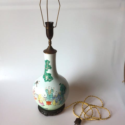 Et par bordlamper i form af vaser af porcelæn i polykrom overglasur, med messing montering og store skærme af rå silke. Højde i alt inkl. skærm 81 cm. Vase eks. montering H. 43 cm. I fin stand, sælges kun samlet.
