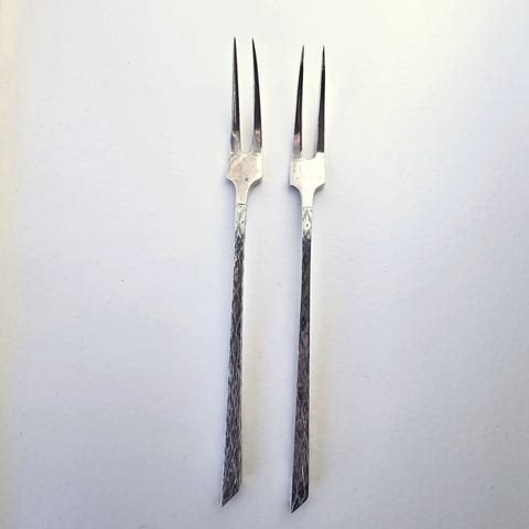 Et par gafler af messing, håndtag med sølv. Med tilhørende æske. Sidste halvdel 1800 tallet. L. 20,5 cm.