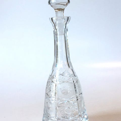 Vintage russisk karaffel af slebet krystal. Med etikette: Made in USSR. I perfekt stand. Højde inka. prop. 28,5 cm. Indhold cirka 0,3 liter.