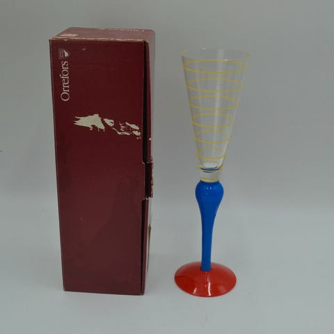 Orrefors Clow champagne glas med rød stilk og blå prikker. designet af Anne Nilsson, måler 26,5cm høj i hel og fin stand Pris 575kr.
