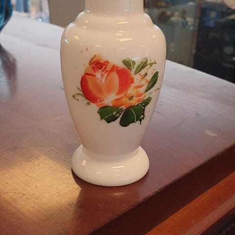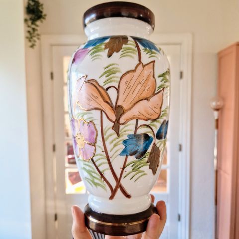 Sød lille opaline vase med håndmalede blomster og guldkant i fin stand, se billeder