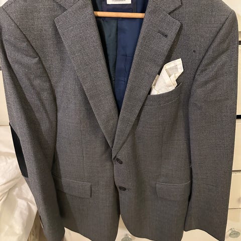Lækker habitjakke i meget skøn, tynd uld kvalitet fra Guzman. Blå / petroleumsfarvet tern og sildebensvævning.