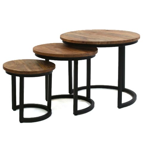 Dette elegante sæt af to sofaborde kombinerer det naturlige udtryk fra mangotræ med et industriel præg fra de sorte metalben. Bordpladerne er lavet af solidt mangotræ, der fremhæver en varm og indbydende tone i ethvert rum, mens den mørke finish giver en stilfuld kontrast til de slanke, sorte metalben.