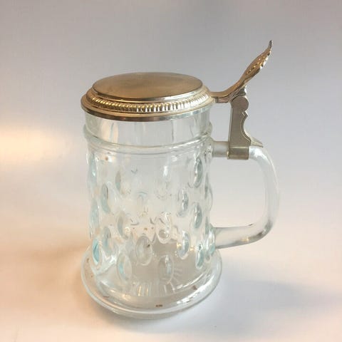 Gammelt glas lågkrus med tin låg. Inskription på toppen af låget "Elsa".