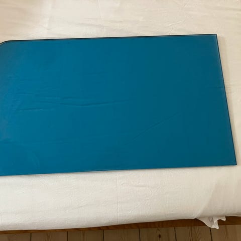 Glas plade i svag grønlig nuance, klar på den ene side og støvet på den anden.