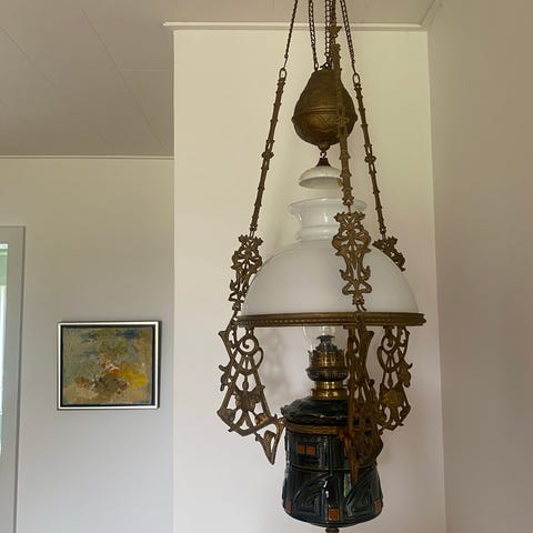 Messingrammen er kunstfærdigt udformet med detaljerede udsmykninger, der ligner blomster og blade, hvilket giver lampen et antikt præg. Rammen er hængt op med kæder, der er fastgjort til loftet, hvilket giver lampen en svævende effekt.
