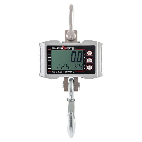 Kranvægt SBS-KW-1000/10O fra Steinberg Systems kan både anvendes stationært i et butikslokale og transporteres. Den er velegnet overalt hvor man ønsker at veje tunge genstande. Vægten imponerer med særligt præcise vejeresultater samt praktiske funktioner som tarering og addering. Vægten er forhåndskalibreret til at veje i kilogram (kg) og pund (lb). Vejeenheden kan nemt skiftes med et tryk på knappen. Hængevægten er udstyret med en beskyttelse mod overbelastning så brugeren bliver gjort opmærksom på, når den maksimale vægt er overskredet. Det førsteklasses kabinet er fremstillet i helstøbt aluminium som er ekstra robust og beskytter kranvægten mod skade. Sikkerhedskrogen af rustfrit stål er egnet til at veje genstande på op til 1,000 kg. Kranvægt SBS-KW-1000/10O bruger fire batterier type AA. Takket være den medfølgende fjernbetjening kan kranvægten styres på en afstand af op til 30 meter. Kranvægtens LED-display har en høj opløsning og kan aflæses fra alle vinkler selv under dårlige lysforhold. Displayet slukker automatisk efter 60 minutter hvilket er med til at forlænge batteriernes levetid.
