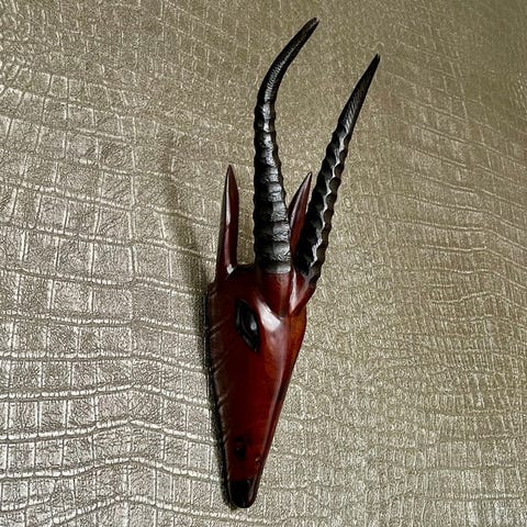 Dette unikke træhoved er en smuk repræsentation af afrikansk kunsthåndværk, udskåret med fine detaljer, der virkelig fremhæver håndværkets skønhed. Selvom jeg ikke kender den præcise alder, anslås det at stamme fra 1970'erne eller tidligere. Målene er cirka 19x13x10 cm.