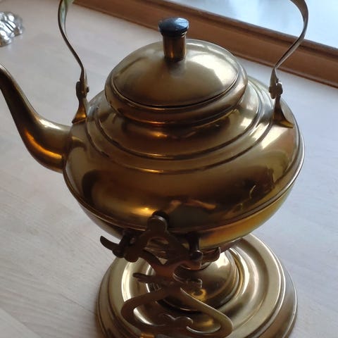 Spændende antik massiv messing tekande med hank og æblestilk låg.