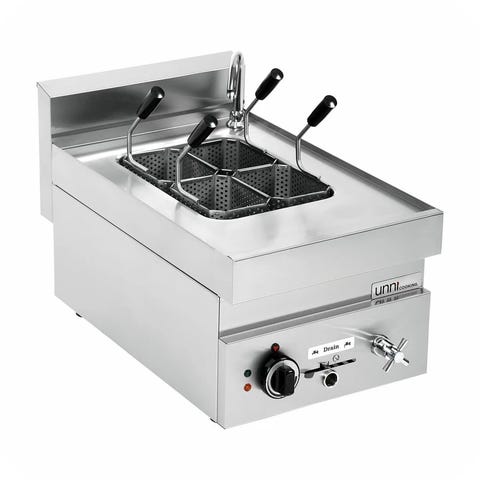 Denne professionelle dobbelt pastakoger er designet med fokus på både funktionalitet og brugervenlighed. De to separate betjeningspaneler giver kokkene fuld kontrol over temperaturen og kogningstiden i hver kogekammer, så pastaen altid bliver tilberedt til perfektion. Det rustfri stålkonstruktion sikrer holdbarhed og let rengøring efter brug, hvilket sparer tid og besvær i køkkenet.