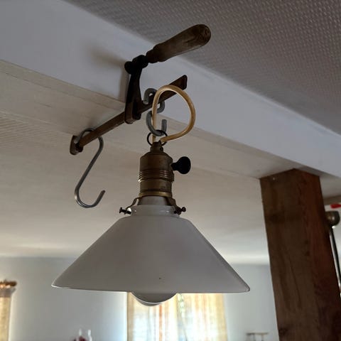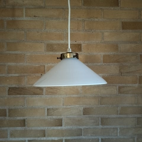 Ældre opal hvid skomager glas pendel med porcelænsfatning.