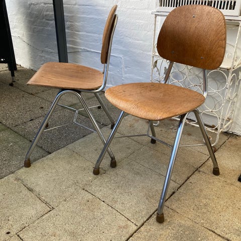 Retro skalstole i teaktræ – stabelbare og vintage skolestole