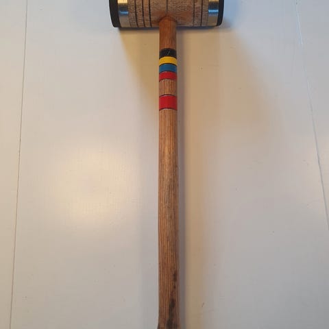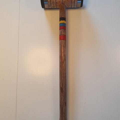 Unik og dekorativ kroketkølle til salg! Dette er måske dem eneste af sin art, og den vil med garanti tilføje en autentisk og rustik stemning til dit næste kroketarrangement. Køllen er af ældre dato, hvilket giver den et unikt og patineret udseende. Med dens karakteristiske design og slidte finish, vil denne kroketkølle være en spændende tilføjelse til din samling.