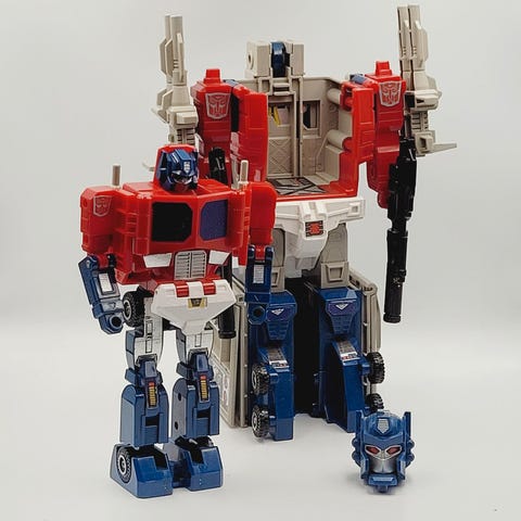 Træd ind i fortiden med en original 80'er Powermaster Optimus Prime ! Dette er ikke bare en transformerfigur; det er en tidskapsel af nostalgisk kraft og autentisk historie. Fra den robuste lastbilform til den majestætiske krigsrobotform er hver del af denne figur et stykke legetøjshistorie.
